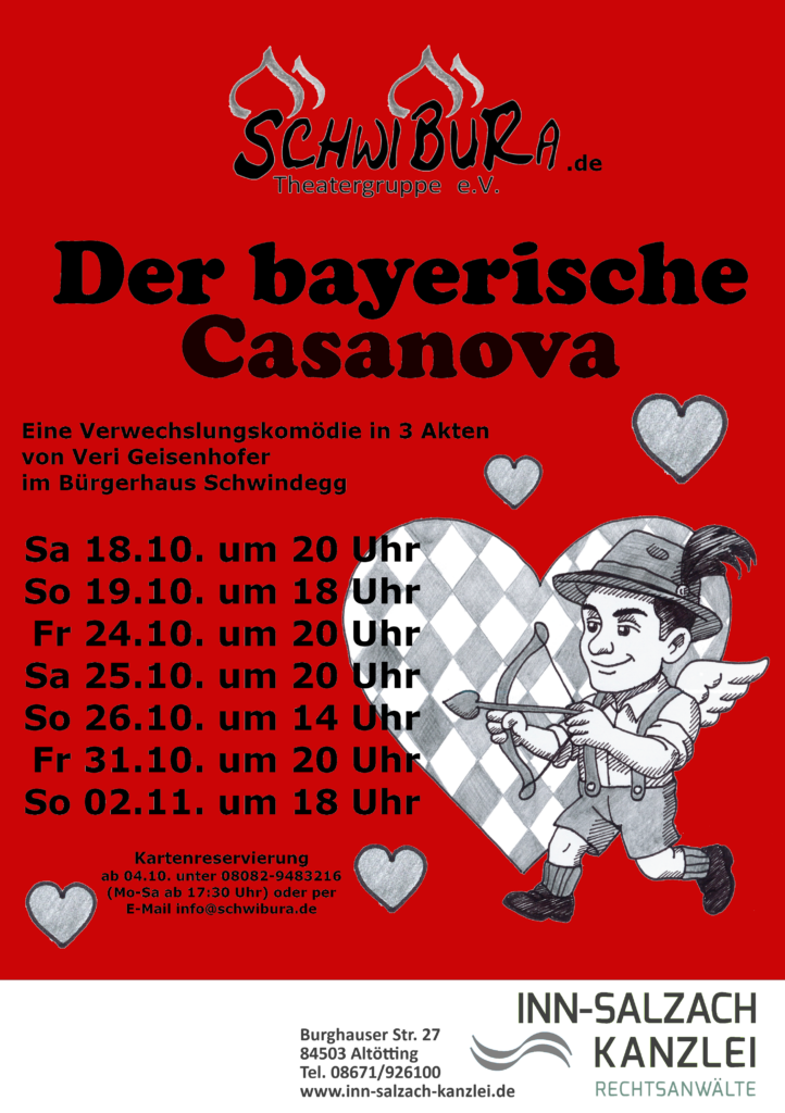 „Der bayerische Casanova“ in 3 Akten von Veri Geisenhofer ist eine lustige und turbulente Verwechselungsgeschichte. Die Aufführungen finden wie immer im Bürgerhaus Schwindegg statt.